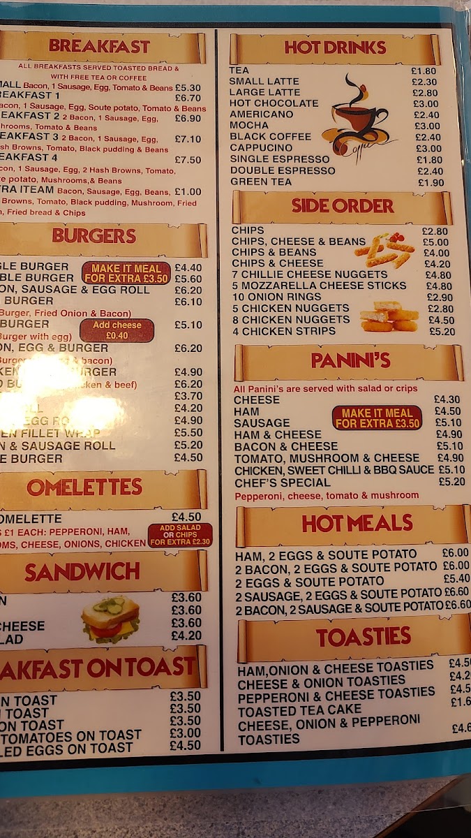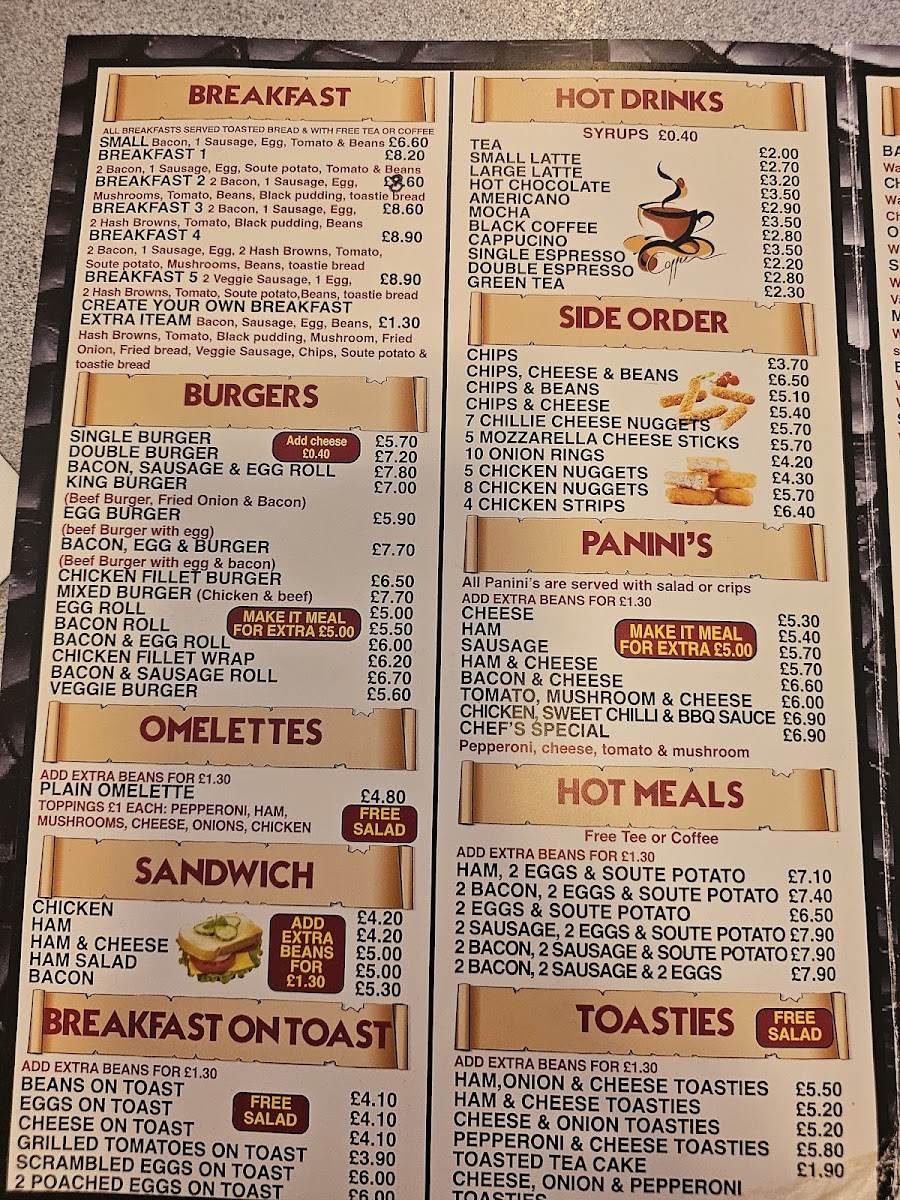 The Panini's collection is equally tempting, with options like the Chicken, Sweet Chilli & BBQ Sauce Panini (£6.90) and the Ham & Cheese Panini (£5.70), perfectly grilled for a satisfying crunch. These handheld delights are ideal for a quick lunch or a warming snack on a chilly day.